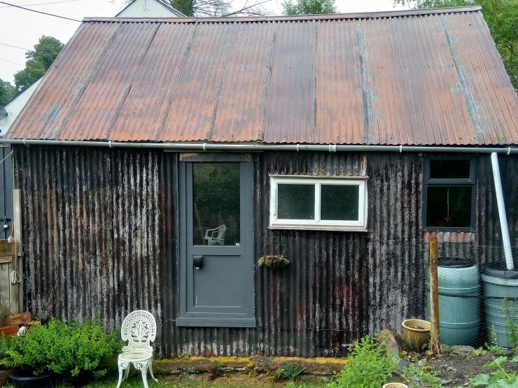 Probably 100 years old, this traditional corrugated iron building has been divided into 2. The front provides Steve with a home for tools, motorbike, cycles, stationary engine and his thinking chair. The rear half is where Jude can get crafty with sewing machines.